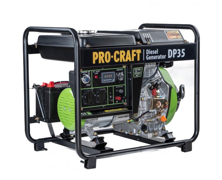 Дизеловия генератор Procraft DP35 е предназначен за използване като независим генератор на електрически ток при прекъсване на електрозахранването, като източник на енергия по време на строителство, или където няма електрическа мрежа. Предимството е по-нисък разход на гориво и по-продължителна употреба в сравнение с бензиновите генератори. Благодарение на високата си производителност, той позволява захранване не само на битови уреди, но и на индукционни уреди. Дизеловия генератор разполага с резервоар за гориво с обем 12,5 л, което гарантира продължителна непрекъсната работа.