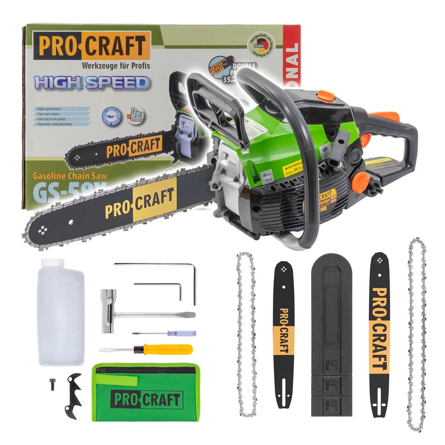 Procraft GS-58X е верижен трион с висока скорост и мощност, с мощен двигател и отлична производителност. Основната му характеристика е високоефективен двутактов двигател 38 кубика с 2.7 к.с. (2 kW). Тази производителност е достатъчна, за да осигури стабилна скорост на веригата от 11500 об/мин.