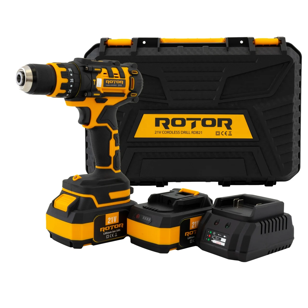 ROTOR RDB21 Безчетков винтоверт 21V/3 Ah, 1350 об/мин, 18+1 степени,10 мм метален патронник, 30 Nm, Set – 2 бр батерии 21V/3 Ah 1 бр зарядно