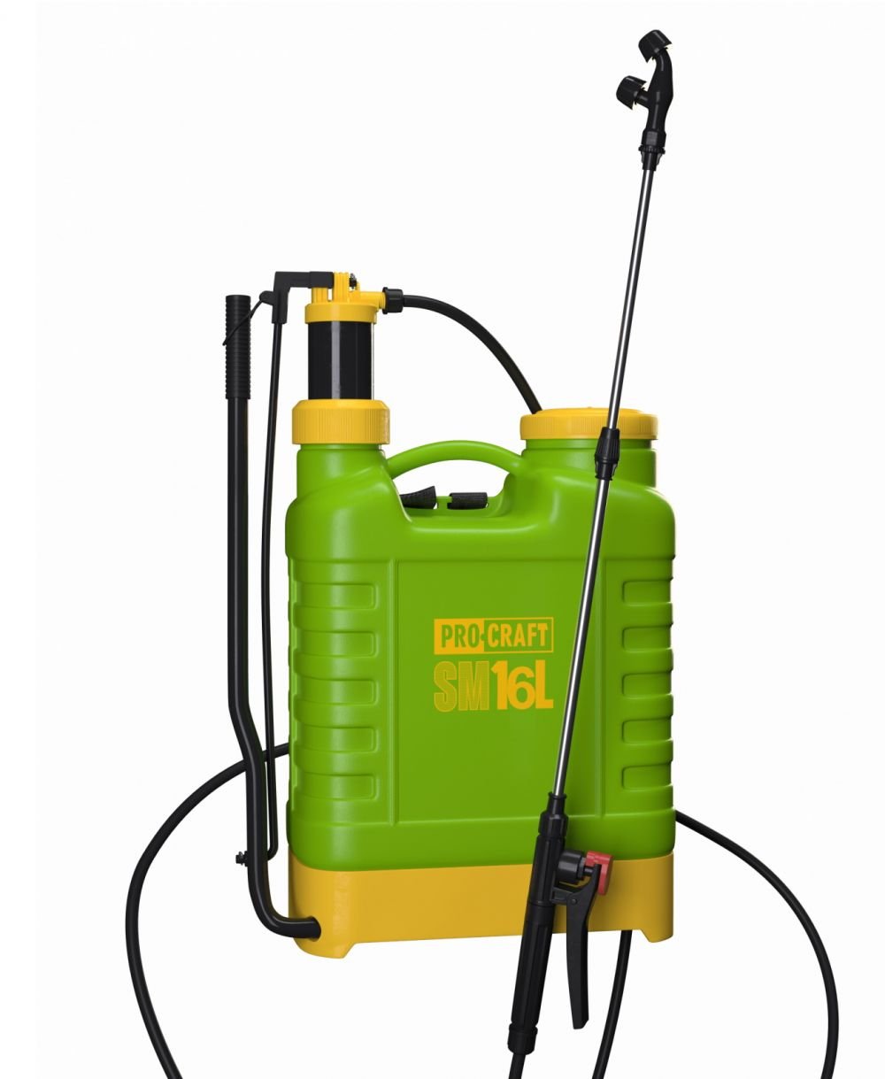 PROCRAFT SM16L e ръчна пръскачка с 3 дюзи, резервоар 16 л, дължина на маркуча 120 см и 82 см телескопичен прът с лека алуминиева тръба, подходяща за продължителна употреба. Притежава накрайник с един изход за струя, за увеличаване на максимално разстоянието на пръскане, накрайник с два изпускателни отвора за покриване на по-голяма площ и накрайник за пръскане на храсти или зеленчукови растения. Има сито за филтриране на течността